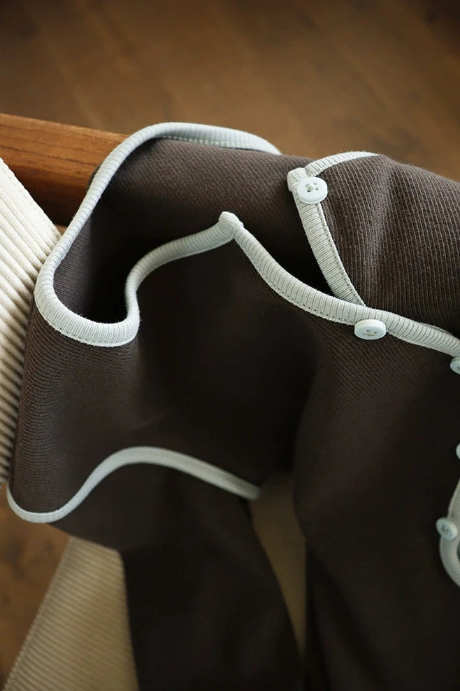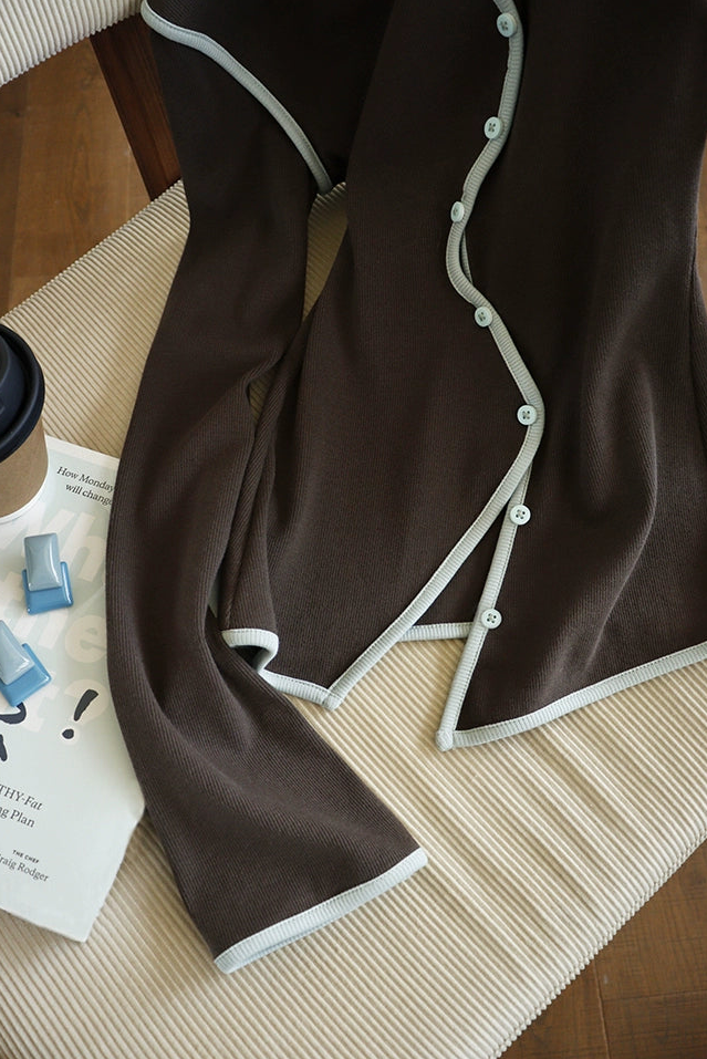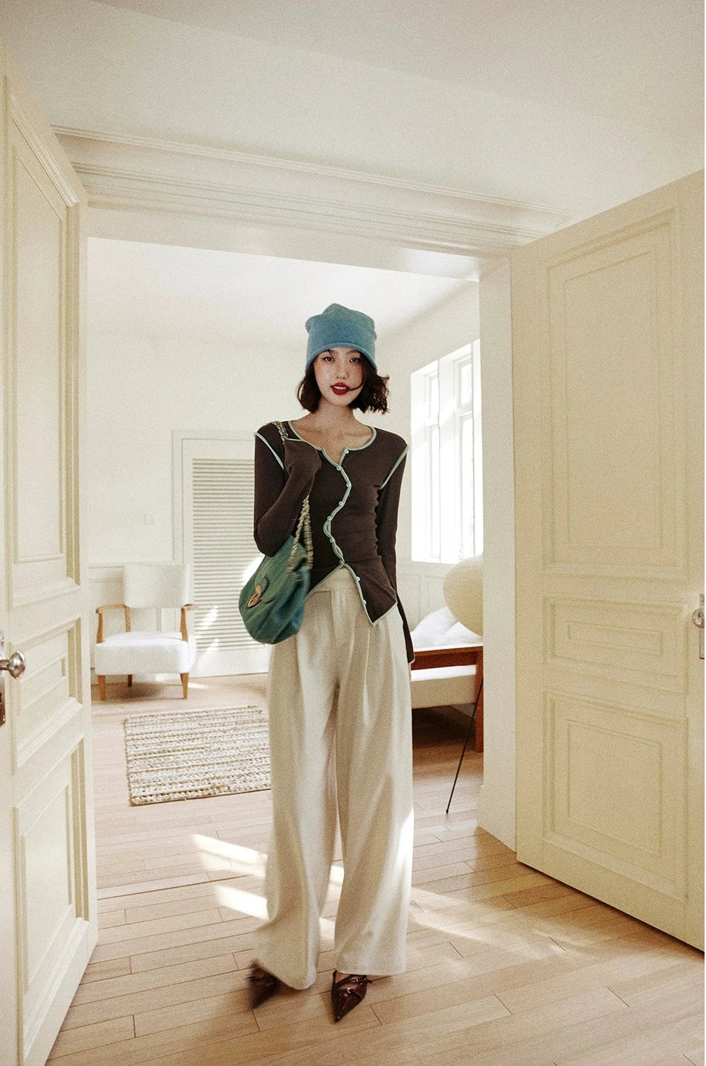 曲線を描くアシンメトリーなボタンラインと配色トリムが印象的な、洗練されたロングスリーブトップ。
