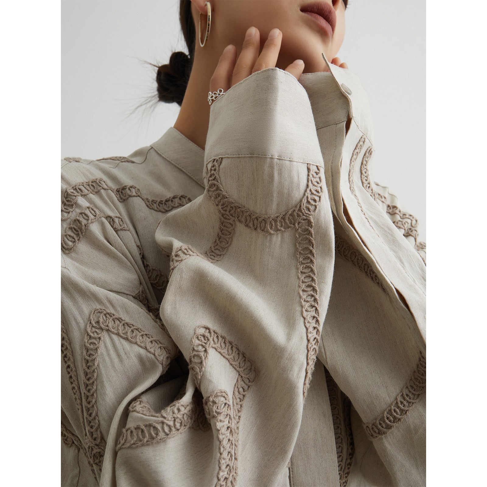 立体感のあるコード刺繍が、シンプルな装いに奥行きを添えるスタンドカラーシャツ。