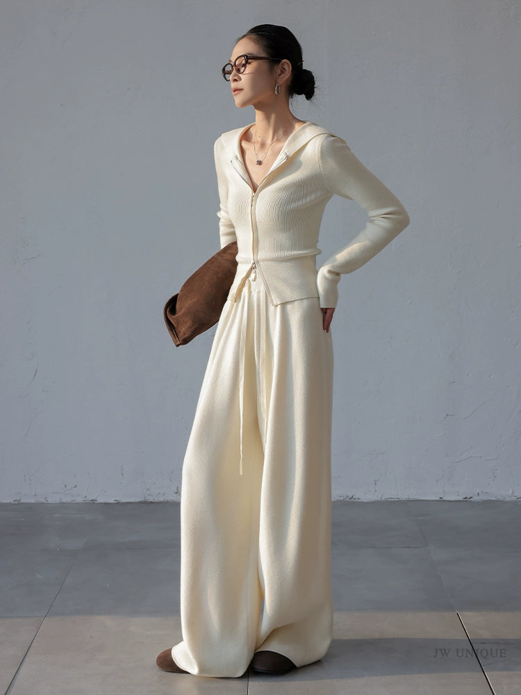 フード付きのジップアップカーディガンとニットパンツのセットアップ。